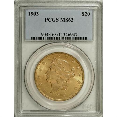 <B>1903 $20 MS63 PCGS.</B></I> This Select 1903 twenty displays pleasing apricot-gold patination tinged with traces of mint-green. These attributes are complemented by radiant luster, accentuating the coin's overall eye appeal. A few light marks preclude a higher grade. The high quality of production and plentiful supply resulting from the uncovering of some large hoards make the 1903 a popular type coin.<BR><BR><b>Shipping:</b> Coins & Currency (<a target="_blank" href="http://www.heritageauctions.com/common/shipping.php">view shipping information</a>)