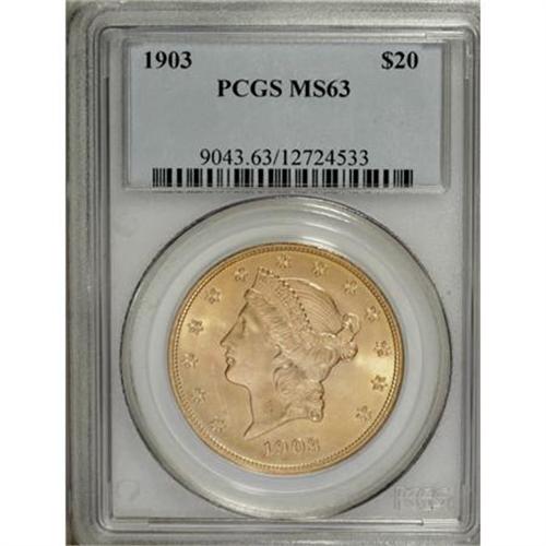 <B>1903 $20 MS63 PCGS.</B></I> A sharply struck and shining yellow-orange example of this 20th century issue, slightly hazy with only a few overt abrasions. The overall eye appeal is consistent with the grade assigned.<BR><BR><B>Coin Engraver:</B> James B. Longacre<BR><BR><b>Shipping:</b> Coins & Currency (<a target="_blank" href="http://www.heritageauctions.com/common/shipping.php">view shipping information</a>)