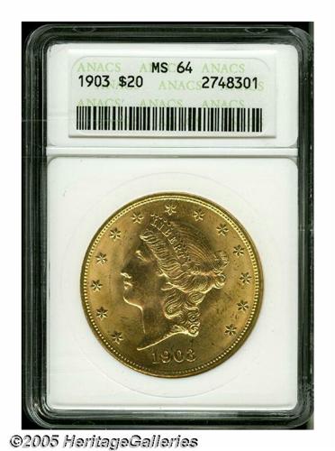 <B>1903<$20> MS64 ANACS.</B></I> Highly attractive example with bright, pink-hued luster and well preserved surfaces that lack many of the usual bag-marks found at this grade.