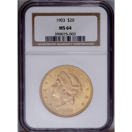 <B>1903 $20 MS64 NGC.</B></I> Frosty luster over greenish-gold surfaces, well struck, and with a clean cheek on Liberty. A few light scrapes in the left obverse field perhaps limit an even higher grade.
