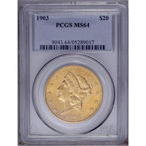 <B>1903<$20> MS64 PCGS.</B></I> A peach-gold Choice double eagle that has a splendid reverse and only minor obverse marks. Lightly die doubled on the RTY in LIBERTY. Scarce only by comparison with its 1904 successor, but a lovely double eagle nonetheless.
