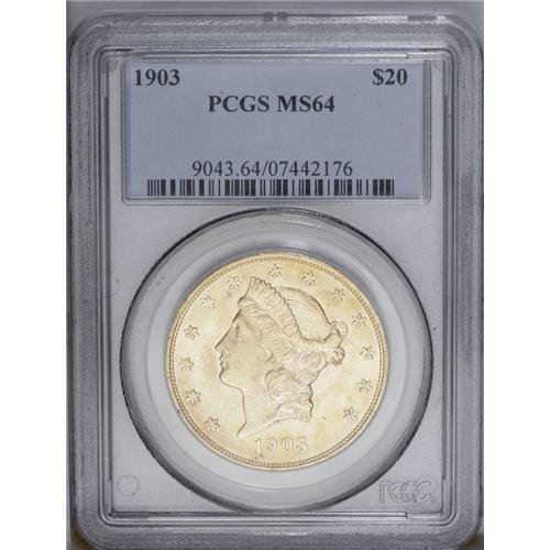<B>1903 $20 MS64 PCGS.</B></I> Boldly struck design features complement highly lustrous yellow and peach-gold surfaces. Miniscule marks on Liberty's cheek and neck and in the left (facing) obverse field preclude a higher grade.