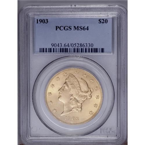 <B>1903 $20 MS64 PCGS.</B></I> Considerable prooflike luster radiates from both sides of this desirable near-Gem specimen, which also offers an extremely bold strike. Premium for the grade and eminently desirable.
