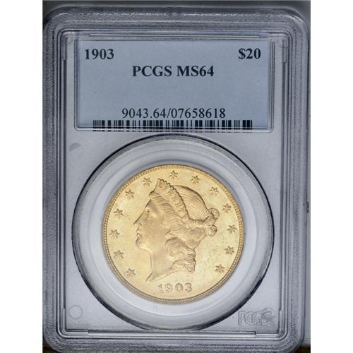 <B>1903<$20> MS64 PCGS.</B></I> Honey-gold patination displays subtle lime-green undertones, and overlies soft luster. The design features are well impressed throughout. Minute marks, which define the grade, are noted over each side.