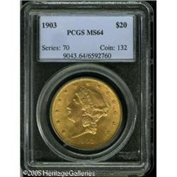 <B>1903 $20 MS64 PCGS.</B></I> Intricately defined on the devices with soft, orange-gold color over the lambent surfaces. Several luster grazes are present, but do not distract from the overall eye appeal of this near-Gem. Lot:9322
