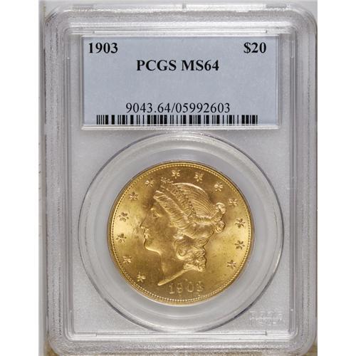 <B>1903 $20 MS64 PCGS.</B></I> Nicely struck, with peach-gold lustrous surfaces. Just a few marks away from full Gem status.<BR><BR><b>Shipping:</b> Coin/Currency (<a target="_blank" href="http://www.heritageauctions.com/common/shipping.php">view shipping information</a>)