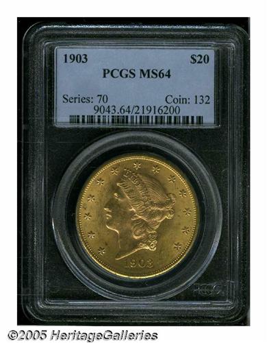 <B>1903<$20> MS64 PCGS.</B></I> The 1903 is readily available in all grades up to and including MS64. The near-Gem presented here offers a couple shades of peach-gold patina imbued with subtle greenish accents. The design features are well impressed throughout, and the lustrous surfaces display just a few minute marks on Liberty's cheek, none of which are particularly bothersome, considering the grade.