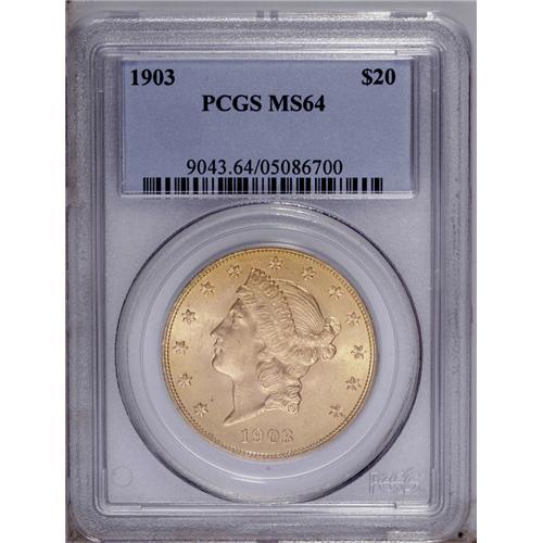 <B>1903<$20> MS64 PCGS.</B></I> This attractive near-Gem displays lustrous, apricot-gold surfaces and sharply struck motifs. The grade is defined by minute marks on Liberty's cheek and neck and in the obverse fields, but yet the smooth surfaces are pleasing to the eye.