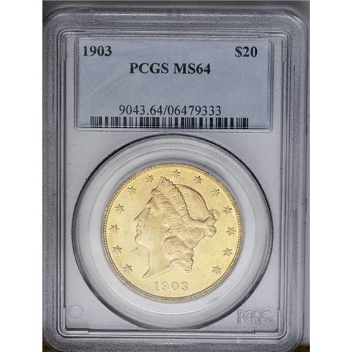 <B>1903<$20> MS64 PCGS.</B></I> This beautiful and lustrous honey-gold near-Gem has pleasing surfaces and a commanding strike. In the better certified Mint State grades, the 1903 is about one-tenth as available as its 1904 successor.