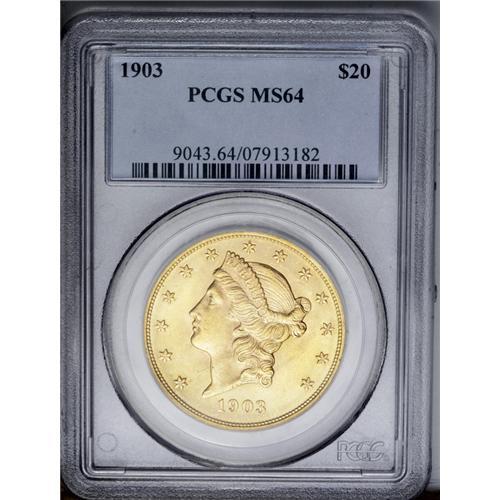 <B>1903<$20> MS64 PCGS.</B></I> This handsome gold type coin possesses impressively smooth fields, and only faint facial marks preclude a desirable MS65 grade. About 10 times scarcer than the 1904, although similarly valued.