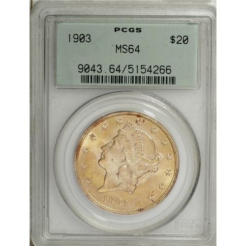 <B>1903 $20 MS64 PCGS.</B></I> Yellow-orange at the outer obverse and straw-gold elsewhere. While not nearly as common as its counterpart in the next year, this issue is available at only a small premium.<BR><BR><b>Shipping:</b> Coin/Currency (<a target="_blank" href="http://www.heritageauctions.com/common/shipping.php">view shipping information</a>)