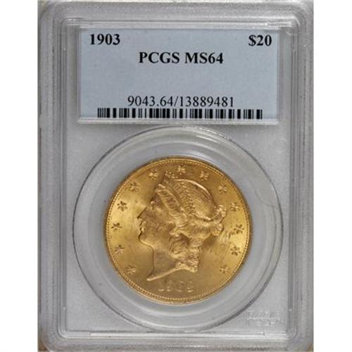 <B>1903 $20 MS64 PCGS.</B></I> This is a sharply struck near-Gem that reveals a few minute obverse marks that define the grade. Both sides are awash in pleasing peach-gold luster.<BR><BR><b>Shipping:</b> Coins & Currency (<a target="_blank" href="http://www.heritageauctions.com/common/shipping.php">view shipping information</a>)