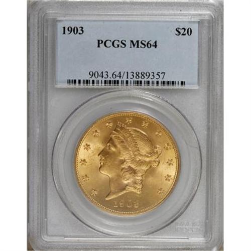 <B>1903 $20 MS64 PCGS.</B></I> Bright yellow-gold color and sharply struck throughout. A lustrous, high-end MS64.<BR><BR><b>Shipping:</b> Coins & Currency (<a target="_blank" href="http://www.heritageauctions.com/common/shipping.php">view shipping information</a>)