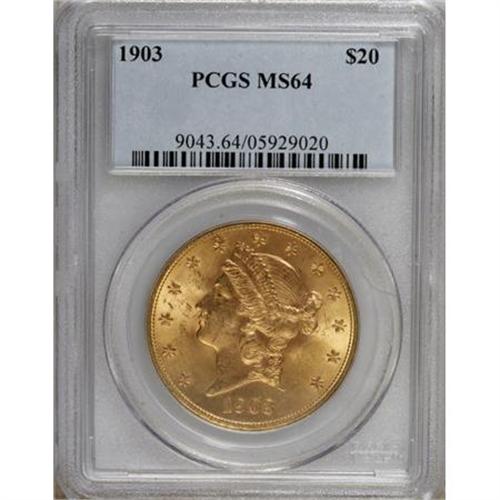<B>1903 $20 MS64 PCGS.</B></I> Lustrous and well struck, with attractive light toning, this impressive near-Gem displays well struck design features and carefully preserved surfaces. The reverse is clean and blemish-free, while the obverse shows a few unimportant marks. <BR><BR><b>Shipping:</b> Coins & Currency (<a target="_blank" href="http://www.heritageauctions.com/common/shipping.php">view shipping information</a>)