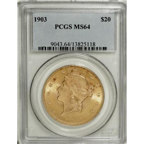 <B>1903 $20 MS64 PCGS.</B></I> Boldly struck with an intense satiny sheen and only a few inconsequential surface marks on the obverse. Scattered alloy stains on either side are the kiss of death to some and meaningless to others.<BR><BR><B>Coin Engraver:</B> James B. Longacre<BR><BR><b>Shipping:</b> Coins & Currency (<a target="_blank" href="http://www.heritageauctions.com/common/shipping.php">view shipping information</a>\)