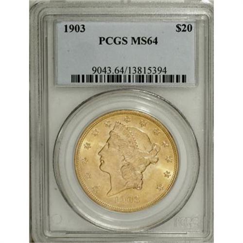 <B>1903 $20 MS64 PCGS.</B></I> PCGS Population (2165/276). NGC Census: (2130/462). Mintage: 287,200. Numismedia Wsl. Price for NGC/PCGS coin in MS64: $1,260. (#9043)<BR><BR><B>Coin Engraver:</B> James B. Longacre<BR><BR><b>Shipping:</b> Coins & Currency (<a target="_blank" href="http://www.heritageauctions.com/common/shipping.php">view shipping information</a>\)