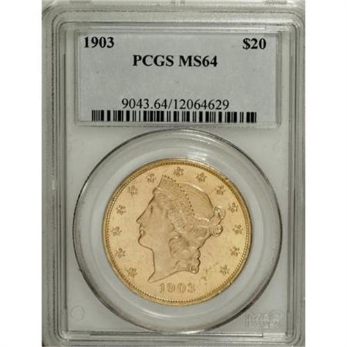 <B>1903 $20 MS64 PCGS.</B></I> PCGS Population (2248/297). NGC Census: (2145/463). Mintage: 287,200. Numismedia Wsl. Price for NGC/PCGS coin in MS64: $1,250. (#9043)<BR><BR><B>Coin Engraver:</B> James B. Longacre<BR><BR><b>Shipping:</b> Coins & Currency (<a target="_blank" href="http://www.heritageauctions.com/common/shipping.php">view shipping information</a>)