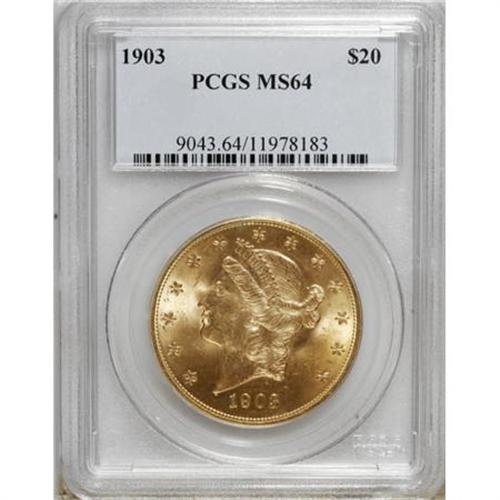 <B>1903 $20 MS64 PCGS.</B></I> Apricot-gold patina displays traces of light tan. A well executed strike brings out strong definition on the design elements, and lustrous surfaces reveal a few minute grade-limiting marks.<BR><BR><B>Coin Engraver:</B> James B. Longacre<BR><BR><b>Shipping:</b> Coins & Currency (<a target="_blank" href="http://www.heritageauctions.com/common/shipping.php">view shipping information</a>)
