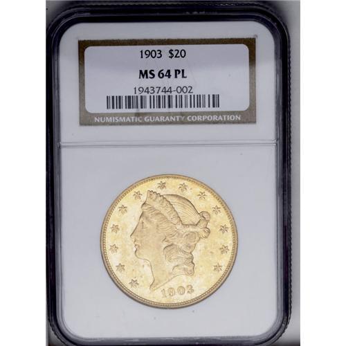 <B>1903<$20> MS64 Prooflike NGC.</B></I> A flashy apricot-gold example, boldly struck and not overly abraded for the grade. Some of the reflectiveness is muted by the patina.
