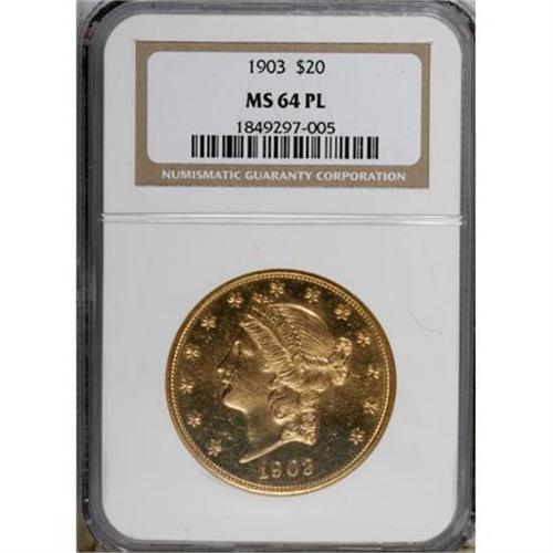 <B>1903 $20 MS64 Prooflike NGC.</B></I> This piece is obviously Prooflike, with massively deep reflectivity in the fields. It also displays attractive mild frost on the central devices, and would probably qualify for the Cameo designation if it were a proof. Well struck and untoned with great eye appeal despite the trivial abrasions that keep it from being a Gem. Census: 4 in 64 Prooflike, 0 finer (5/07). <BR><BR><b>Shipping:</b> Coins & Currency (<a target="_blank" href="http://www.heritageauctions.com/common/shipping.php">view shipping information</a>)
