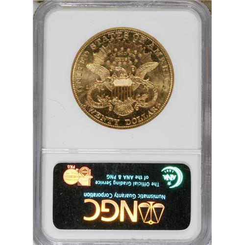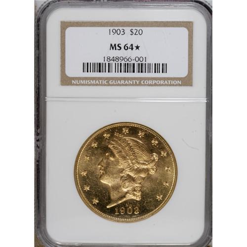 <B>1903 $20 MS64 <img border='0' src='http://www.heritagecoins.com/images/star.gif' width=10 height=10> NGC.</B></I> As of (2/07), the present piece is the only business strike 1903 twenty that has received a Star designation from NGC. Both sides are noticeably prooflike, and this feature is likely the reason for the bestowed Star. This well struck piece has a remarkably clean reverse. The obverse has relatively clean fields and a diagonal thin mark on the cheek.<BR><BR><b>Shipping:</b> Coins & Currency (<a target="_blank" href="http://www.heritageauctions.com/common/shipping.php">view shipping information</a>)