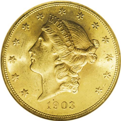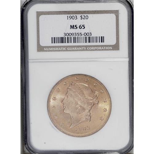 <B>1903<$20> MS65 NGC.</B></I> This frosty Gem is an impressive example with rich honey-gold color, and it represents the finest available quality, despite six pieces that have received a higher grade by NGC (9/06). The collector could spend considerable time, effort, and money just trying to locate such a coin, or alternatively, save all three and bid on this example.