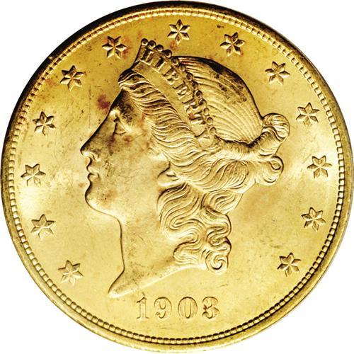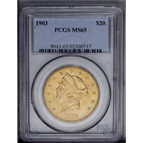 1903 $20 MS65 PCGS. A satiny, minimally abraded repres
