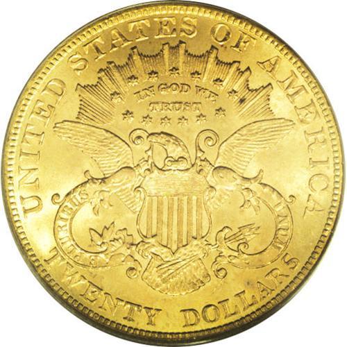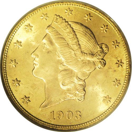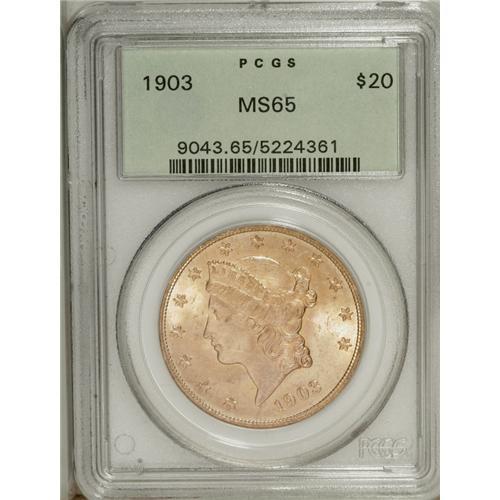 <B>1903<$20> MS65 PCGS.</B></I> Splashes of peach coloration provide substantial eye appeal. Thorough evaluation locates a mark on the base of the E in AMERICA, but the overall preservation is impressive. Even the portrait is without relevant contact. Lightly die doubled on the RTY in LIBERTY. Encapsulated in a green label holder.