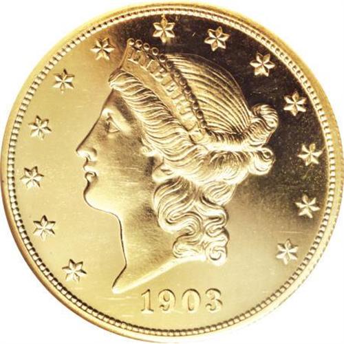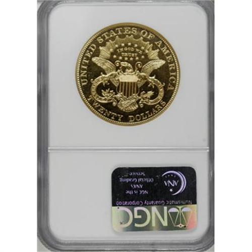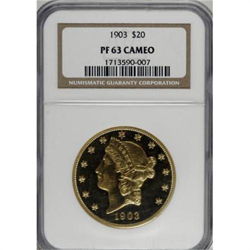 <B>1903 $20 PR63 Cameo NGC.</B></I> Only 158 proof twenties were struck in 1903. All were allegedly of the non-contrast variety of proofing that came into vogue in the Mint in 1901. The cataloger of the Bass coin went so far as to state: " ... all authentic proofs do not have cameo frosted heads." This coin proves that statement to be not entirely correct. The devices, including the head of Liberty, show a slight but noticeable layer of mint frost. When set against the illimitable depth of mirrored reflectivity in the fields, a noticeable cameo effect is evident. Fewer than half of the mintage exists today as recognizable proofs, and less than a third of those have cameo contrast. This piece displays unfathomable depth of mirrored reflectivity with two-toned contrast on each side. Hairlined on the obverse, which explains the PR63 grade, but more attractive in overall eye appeal than the grade would infer. <BR><BR><b>Shipping:</b> Coins & Currency (<a target="_blank" href="http://www.heritageauctions.com/common/shipping.php">view shipping information</a>)