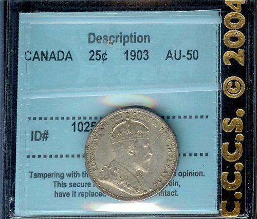 1903 25¢ CCCS AU50. Light to medium toning over underlying lustre.