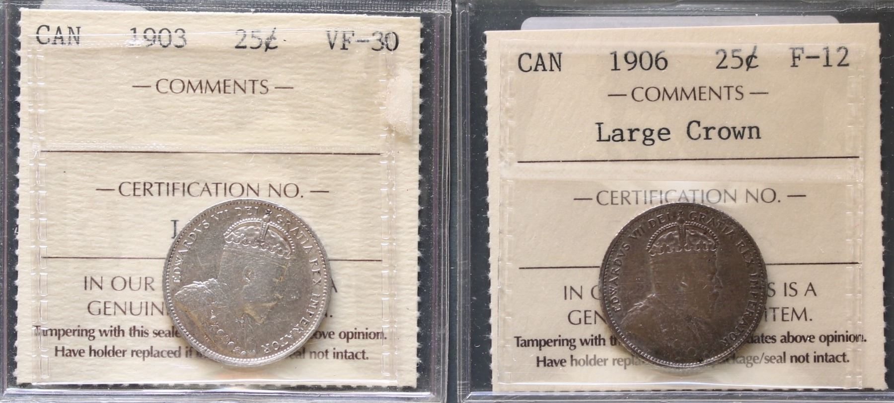 1903 25¢ Choice Very Fine-30 & 1906 Fine-12. Lot of 2 ICCS graded coins.