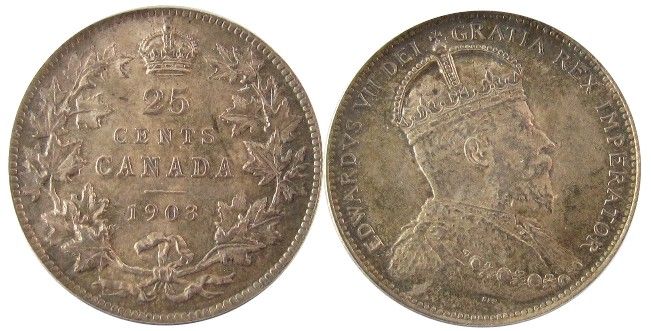 1903 25¢ PCGS MS65. Hazel tones and fantastic underlying lustre. Very scarce in Gem condition. Trends $11,000