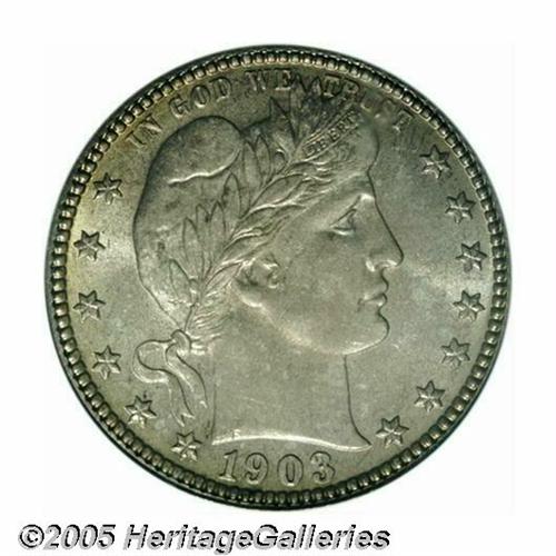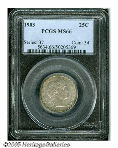 <B>1903<25C> MS66 PCGS.</B></I> This is a nicely struck premium Gem whose surfaces are as smooth as the day this coin left the Mint. Swirls of apricot-gray and rose iridescence compete for dominance on both sides of this original P-mint example. Surprisingly elusive above the MS64 level despite a sizeable mintage of 9,670,064 pieces, this MS66 example fits clearly within the Condition Census. NGC and PCGS combined report only five examples at the present level and none are finer (4/05).