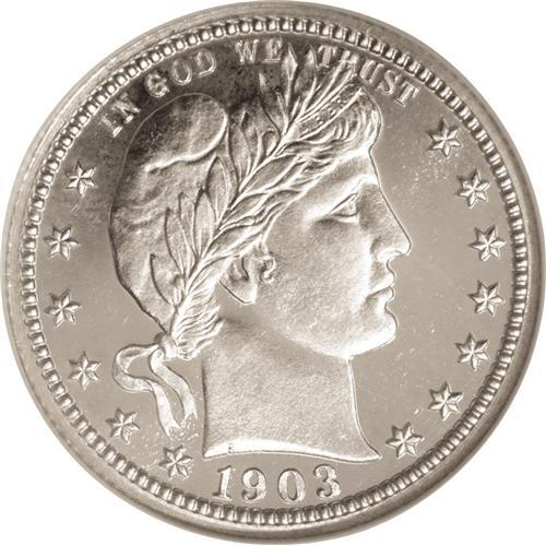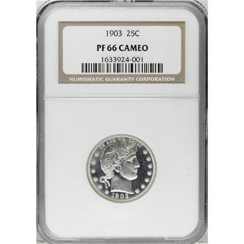 <B>1903 25C PR66 Cameo NGC.</B></I> A hint of champagne-gold across the upper obverse field is the only barrier to full black-and-white contrast, since the devices are thickly frosted. A boldly impressed and suitably preserved example of this sometimes-elusive proof issue. Census: 10 in 66 Cameo, 18 finer (12/06).<BR><BR><b>Shipping:</b> Coin/Currency (<a target="_blank" href="http://www.heritageauctions.com/common/shipping.php">view shipping information</a>)