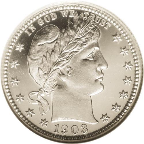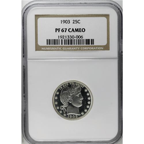 <B>1903<25C> PR67 Cameo NGC.</B></I> This brilliant Superb Gem features radiant, intricate devices and essentially flawless fields. White-on-black contrast is formidable, and perhaps only die polish (as made) near the ear prevents a desirable Ultra Cameo designation. A stingy 755 proofs were struck. Census: 7 in 67 Cameo, 10 finer (6/06).<BR><I>From The Mulholland Collection.</B></I>
