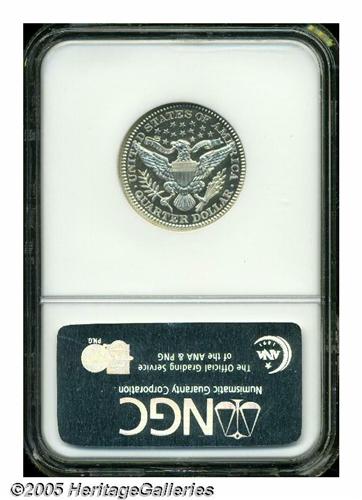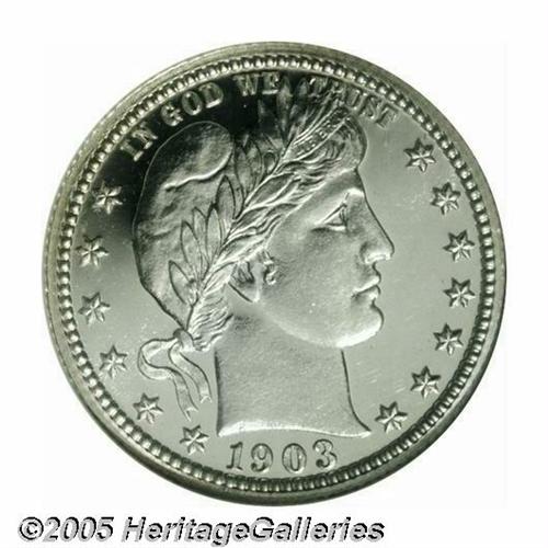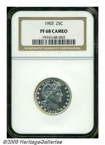 <B>1903<25C> PR68 Cameo NGC.</B></I> Fully brilliant and essentially as it came off the dies 102 years ago, with appreciable contrast for an early 20th century proof. A small area near Liberty's ear has a reflective surface, an annually recurring mint-made feature assumedly due to energetic polishing of the working hub on the part of a mint employee. Population: 8 in 68 Cameo, 1 finer (4/05).