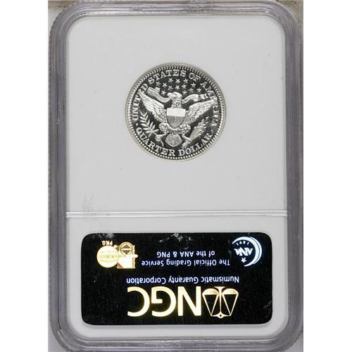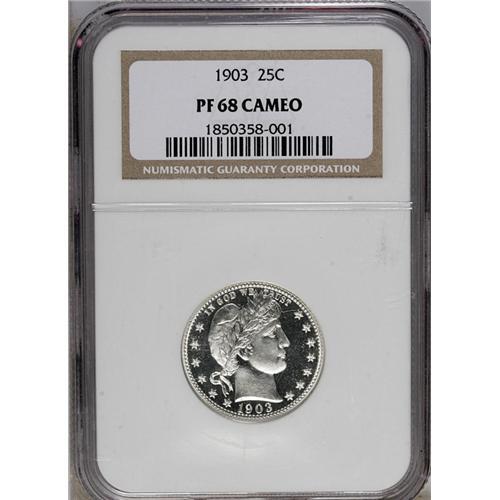 <B>1903<25C> PR68 Cameo NGC.</B></I> Fully brilliant and essentially as it came off the dies 103 years ago, with appreciable contrast for an early 20th century proof. A small area near Liberty's ear has a reflective surface, an annually recurring mint-made feature assumedly due to energetic polishing of the working hub on the part of a mint employee. Census: 9 in 68 Cameo, 1 finer (7/06).