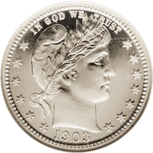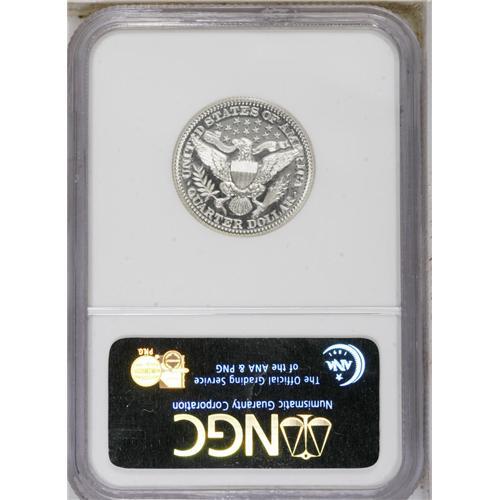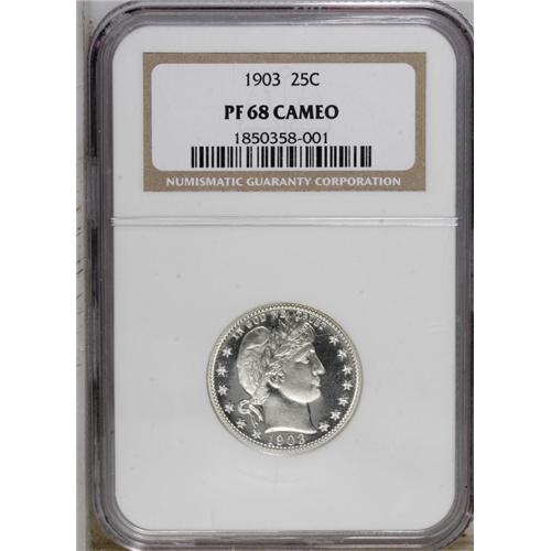 <B>1903<25C> PR68 Cameo NGC.</B></I> Fully brilliant and essentially as it came off the dies 103 years ago, with appreciable contrast for an early 20th century proof. A small area below Liberty's ear has a reflective surface, an annually recurring mint-made feature assumedly due to energetic polishing of the working hub on the part of a mint employee. Census: 11 in 68 Cameo, 1 finer (9/06).