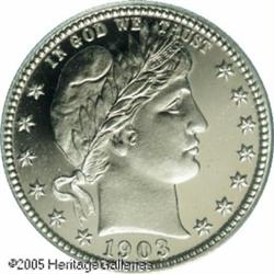 <B>1903 25C PR68 Deep Cameo PCGS.</B></I> We are pleased to be offering many spectacular representations of proof Barber coinage in the Bruce Scher Sale. The present Superb Gem is the finest proof 1903 Barber Quarter that we have handled in several years, and the single finest Deep Cameo example we have <I>ever</B></I> sold. The level of surface preservation is truly remarkable, with not a single distracting blemish in evidence. Unsightly toning is also absent, with both sides being fully brilliant and snow-white. Richly frosted with razor sharp striking definition, the devices contrast markedly with the glassy fields. The Philadelphia Mint produced 9,670,064 Quarters in 1903, 755 pieces of which were proofs. Although this date is not rare in either business strike or specimen formats, it is still a condition rarity in grades as high as that represented by the present example. A coin that is earmarked for inclusion in the finest specialized collection. This coin is tied with just one other at PCGS as the finest known 1903 Quarter with Deep Cameo surfaces (1/05).<BR><I>From the Bruce Scher #1 All-Time PCGS Registry Set.</B></I> Lot:4095