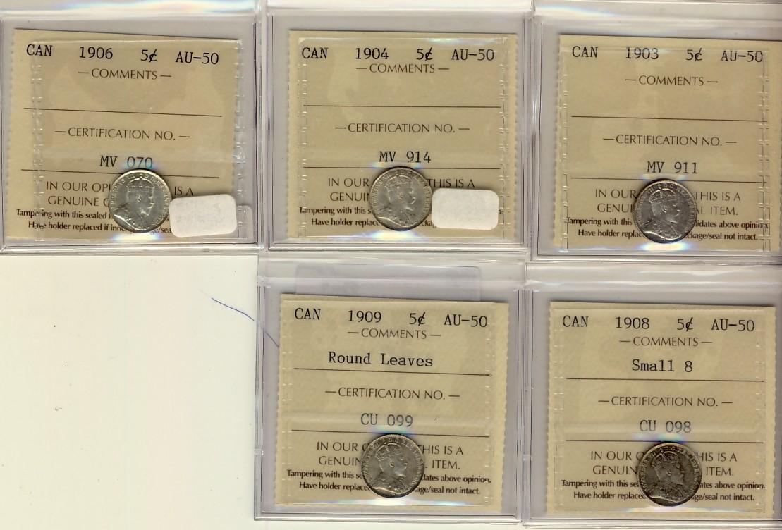1903 5¢, 1904, 1906, 1908 Sml & 1909 RL ICCS AU50. Lot of 5 coins.