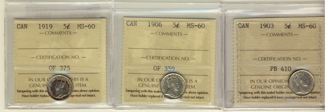 1903 5¢, 1906 & 1919 ICCS MS60. Lot of 3 coins.