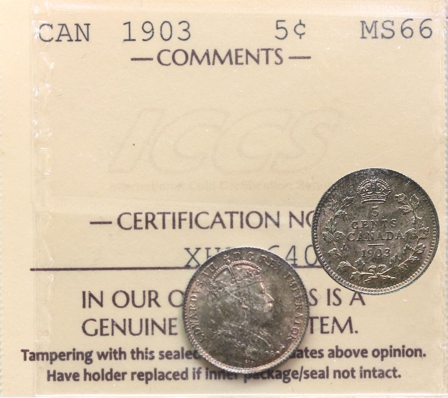 1903 5¢ ICCS Superb Gem Mint State-66. Light autumn shades over full underlying lustre. Wow! Not often offered in this condition, a highly attractive and beautiful example to add to the best of collections.
