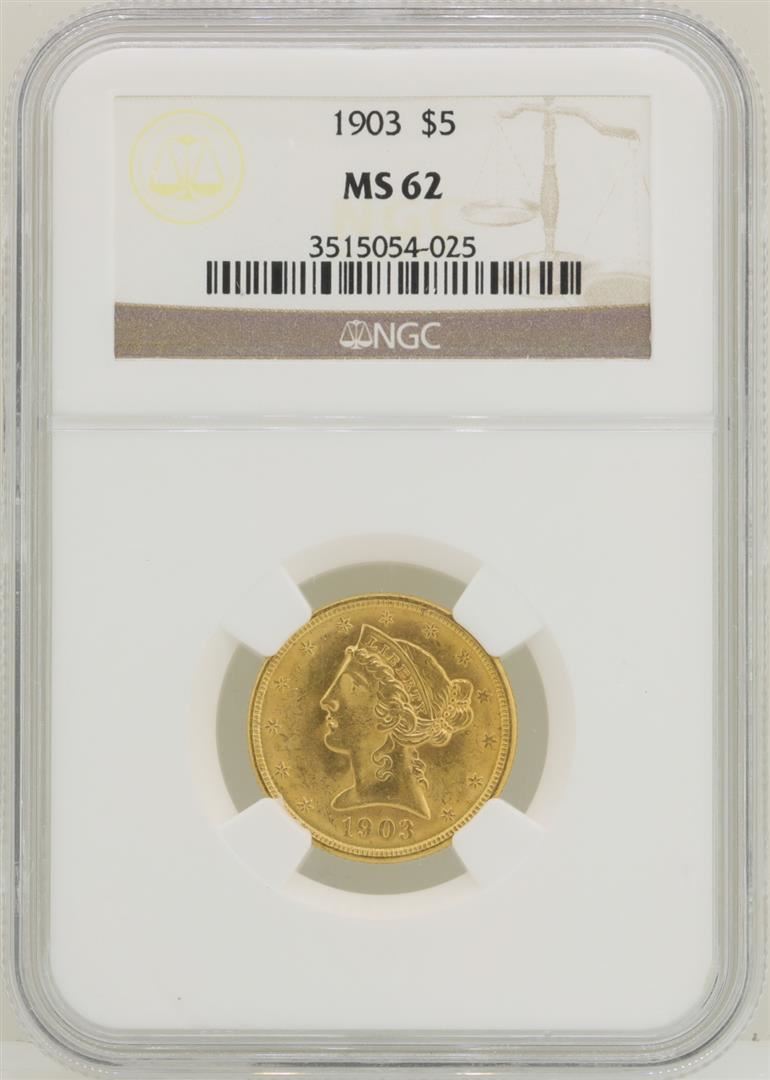 One 1903 $5 Liberty Head Half Eagle Gold Coin NGC MS62. NGC Certified.