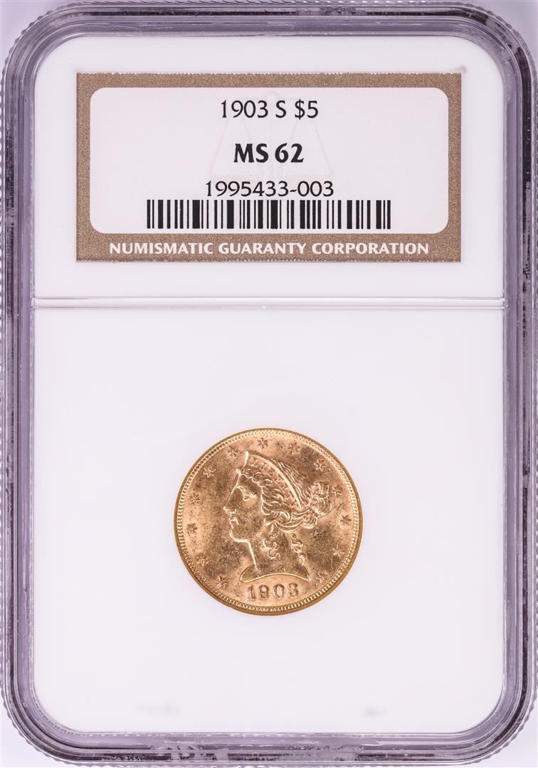 One 1903 $5 Liberty Head Half Eagle Gold Coin NGC MS62. NGC Certified.