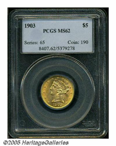 <B>1903<$5> MS62 PCGS.</B></I> Highly lustrous with lovely yellow-gold color, slightly deeper toward the borders. The surfaces are lightly abraded, as expected for the grade.