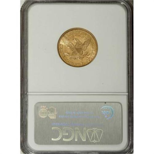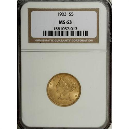 <B>1903 $5 MS63 NGC.</B></I> NGC Census: (221/89). PCGS Population (174/73). Mintage: 226,800. Numismedia Wsl. Price for NGC/PCGS coin in MS63: $665. (#8407)<BR><BR><B>Coin Engraver:</B> Christian Gobrecht<BR><BR><b>Shipping:</b> Coins & Currency (<a target="_blank" href="http://www.heritageauctions.com/common/shipping.php">view shipping information</a>)