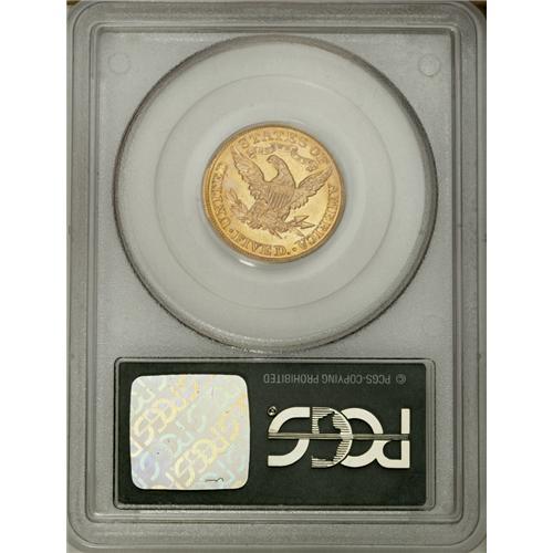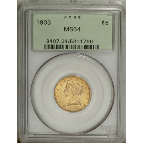 <B>1903 $5 MS64 PCGS.</B></I> A solidly struck yellow-orange near-Gem that has a touch of green in the left reverse field. The obverse fields and Liberty's cheek display minor marks. Population: 52 in 64, 21 finer (10/06).<BR><I>From The James Paul Collection.</B></I><BR><BR><b>Shipping:</b> Coin/Currency (<a target="_blank" href="http://www.heritageauctions.com/common/shipping.php">view shipping information</a>)