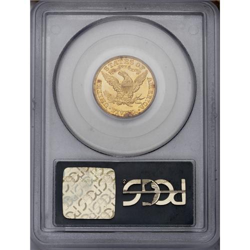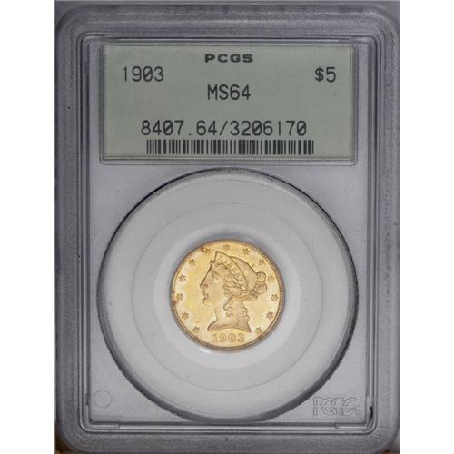 <B>1903<$5> MS64 PCGS.</B></I> Bright orange toning endows this lustrous and exquisitely struck scarcer date Liberty half eagle. An occasional peripheral alloy spot does not appear to limit the grade. Housed in a prior generation holder. Population: 49 in 64, 18 finer (3/06). <BR><BR><B>Important notice:</B> Heritage usually auctions material at the rate of 200-250 lots per hour. On some occasions eBay Live bid software or the Internet may not be able to keep up with the pace of the auction. We recommend placing a realistic absentee bid now as insurance to avoid disappointment. Occasionally the auctioneer may eliminate or reject an eBay Live bid, and the auctioneer may also reopen a lot after the close of the eBay live bidding (usually because we missed an audience bid), and may reject your bid even if it shows you as the winning bidder. By bidding via eBay Live, you agree that Heritage may award the lot to another bidder at its sole discretion under the circumstances described above or any other reasonable circumstances. Since eBay bids are not shown to us until we open the lot on the floor, we treat those bids just like floor bids. In most cases the floor responds before the eBay bid is presented to us, due to Internet lag time, so for consistency we have made it a policy that floor bids are always considered first over tie eBay live bids. Also please note that all Heritage lots purchased through eBay Live carry a 20% Buyer's Premium. Please make sure you read the Terms and Conditions before you bid. This lot is being auctioned in conjunction with a live floor auction by Heritage Galleries & Auctioneers. All final auction and invoice information will be supplied by Heritage Galleries & Auctioneers, and all other information should be considered preliminary. Lot:2851 <BR><BR><B>Winning Notification and Billing:</B> After the FINAL session in this auction is complete, Heritage will send e-mail and snail mail invoices. This process normally takes several days. All final auction and invoice information will be supplied by Heritage Galleries & Auctioneers, and all other information should be considered preliminary. <BR><BR>This auction will be conducted on a live auction floor and over the Internet through eBay Live. If you choose to place an absentee bid, please take a moment to <font color='#0000ff'><u><a href='http://pages.ebay.com/liveauctions/help/before/laabsentee.html'>learn how eBay Live absentee bidding works</a></u></font><font color='#000000'>