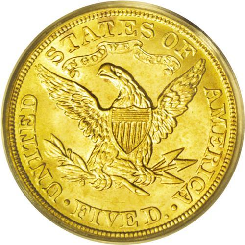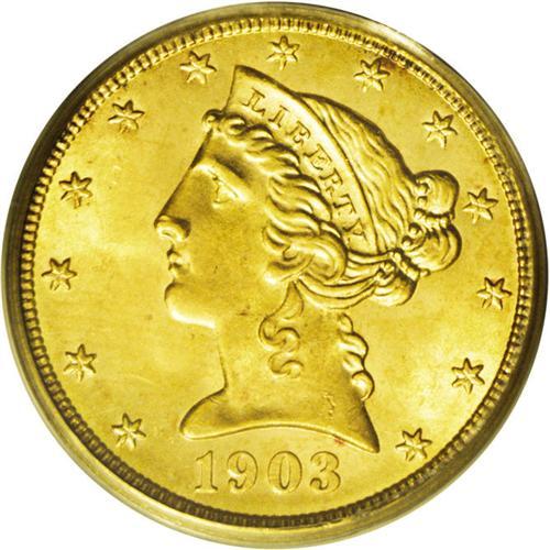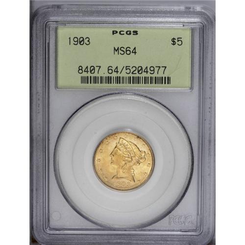 <B>1903<$5> MS64 PCGS.</B></I> Lustrous honey-gold coloring washes the surfaces of this coin, with a horizontal stripe of orange-gold covering the center of the obverse and areas of darker color above the Ts in STATES. This attractive, Choice piece boasts a strong strike and minimal surface marks, in line with the grade. Housed in a green label PCGS holder.