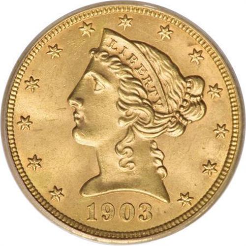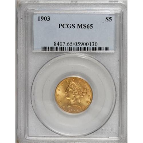 <B>1903 $5 MS65 PCGS.</B></I> An amazing Gem with frosty yellow and orange-gold luster, and void of any noticeable surface marks on either side. The design elements are boldly detailed. For a date considered to be common by most, few finer examples have been certified. Population: 12 in 65, 10 finer (8/07).<BR><BR><B>Coin Engraver:</B> Christian Gobrecht<BR><BR><b>Shipping:</b> Coins & Currency (<a target="_blank" href="http://www.heritageauctions.com/common/shipping.php">view shipping information</a>)